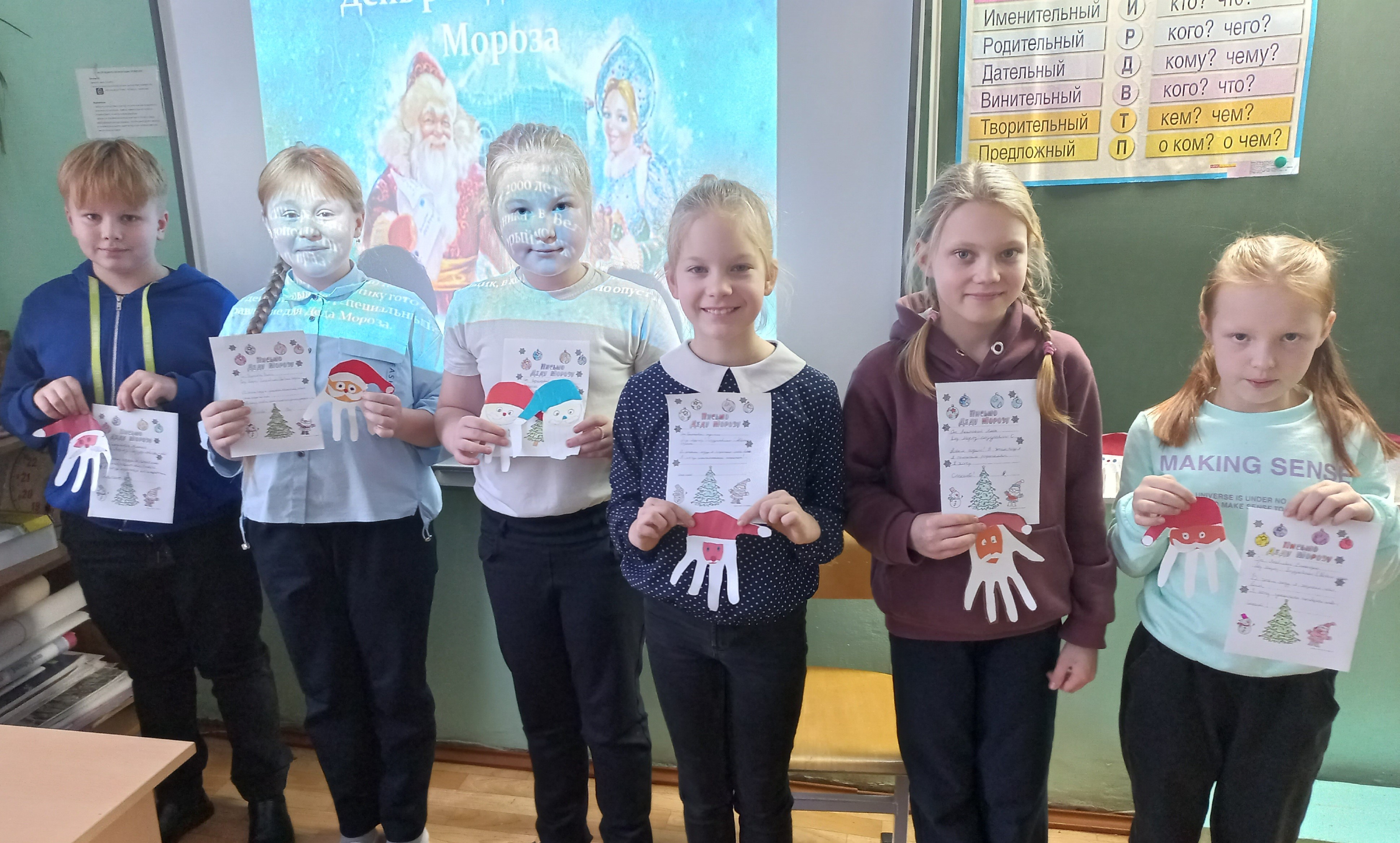 Затем четвероклассники исполнили песню про Деда Мороза, смастерили игрушку на ёлку и, конечно же, каждый ученик оформил красивое письмо для Дедушки Мороза с пожеланиями и поздравлениями.